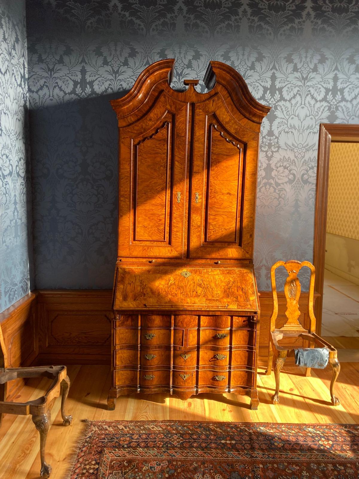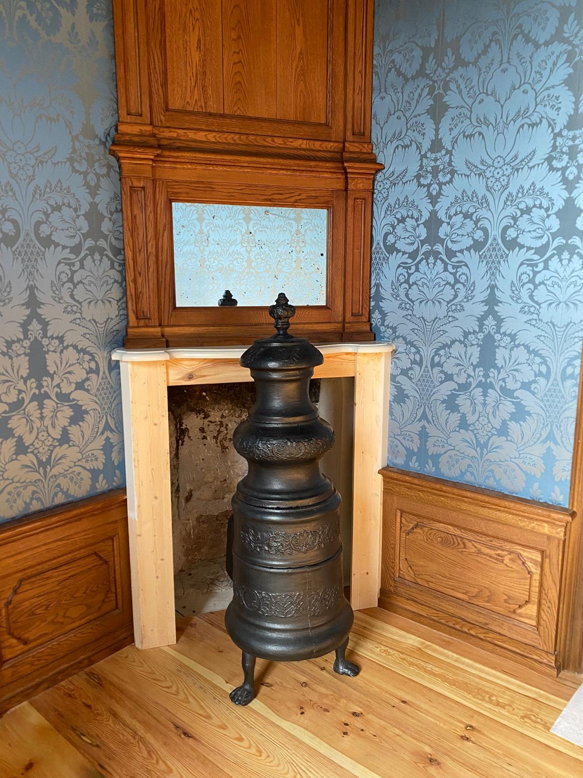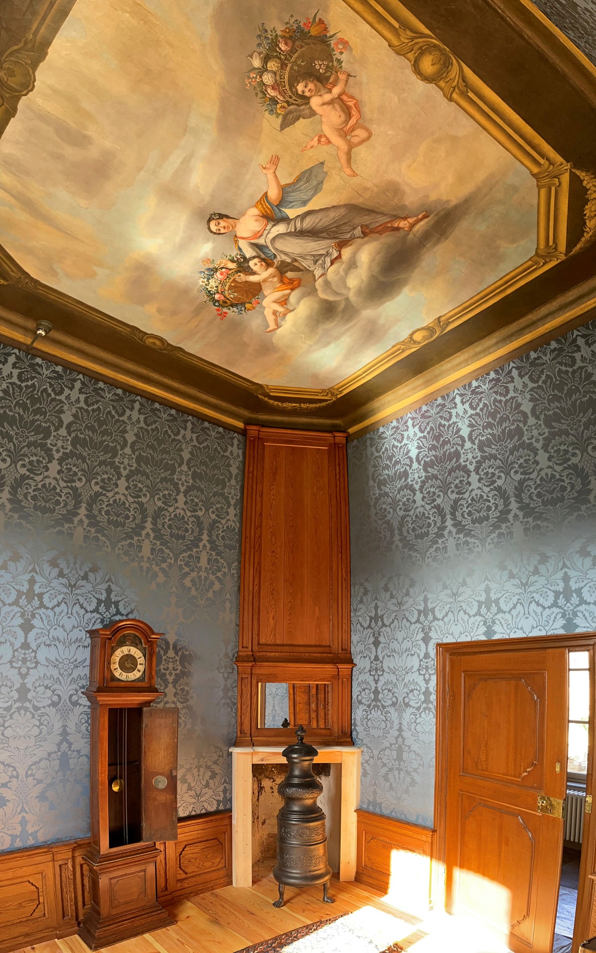 Dat werd een hele klus, want de hele kamer werd aangepakt. Zo kwam er een wandafwerking met blauw linnen, met een ingeweven patroon van bloemen en ranken, precies zoals beschreven in de inventaris uit 1767. Tevens is de eikenhouten lambrisering aan de muren teruggebracht en is de grenenhouten vloer in ere hersteld. Verder zijn de grijs geschilderde deuren en dubbele vensterluiken gerestaureerd met behulp van moderne houtwerking. Om de wandbespanning, meubelen en plafondschilderingen te beschermen, is UV‑werende folie op de ramen aangebracht. Ook zijn er linnen vouwgordijnen en duurzame led‑kaarsen geplaatst in de 18e‑eeuwse wandlampen en kandelaars. Daarnaast is een Duitse gietijzeren Ringwulstöfen uit circa 1750 teruggebracht, destijds een ultramoderne kachel, evenals 18e‑eeuws meubilair om de ruimte compleet te maken.