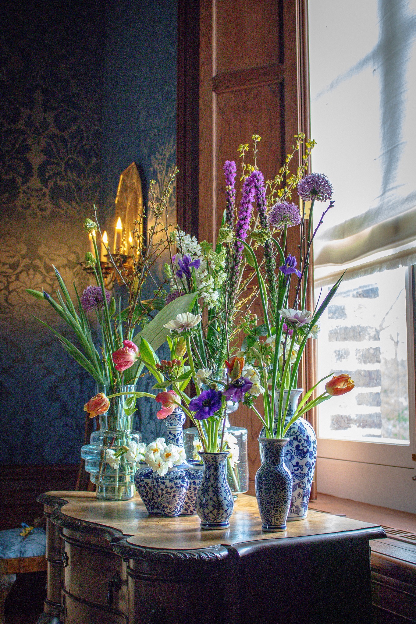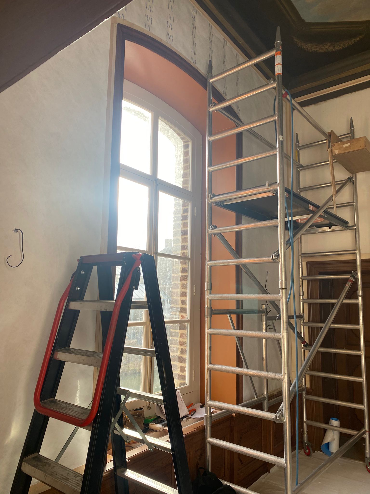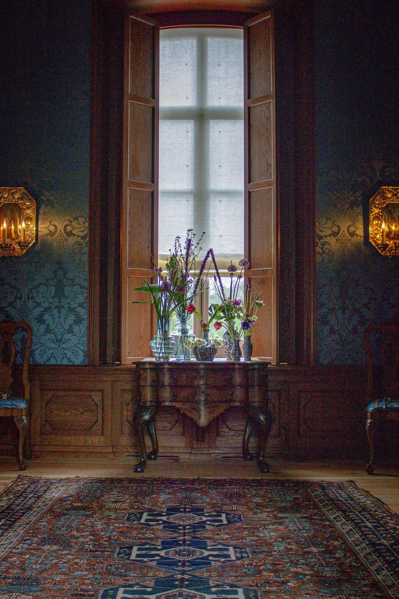 Dat werd een hele klus, want de hele kamer werd aangepakt. Zo kwam er een wandafwerking met blauw linnen, met een ingeweven patroon van bloemen en ranken, precies zoals beschreven in de inventaris uit 1767. Tevens is de eikenhouten lambrisering aan de muren teruggebracht en is de grenenhouten vloer in ere hersteld. Verder zijn de grijs geschilderde deuren en dubbele vensterluiken gerestaureerd met behulp van moderne houtwerking. Om de wandbespanning, meubelen en plafondschilderingen te beschermen, is UV‑werende folie op de ramen aangebracht. Ook zijn er linnen vouwgordijnen en duurzame led‑kaarsen geplaatst in de 18e‑eeuwse wandlampen en kandelaars. Daarnaast is een Duitse gietijzeren Ringwulstöfen uit circa 1750 teruggebracht, destijds een ultramoderne kachel, evenals 18e‑eeuws meubilair om de ruimte compleet te maken.
